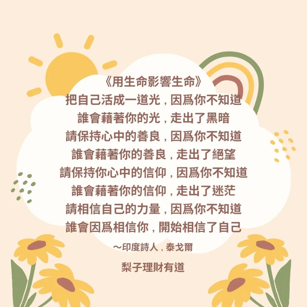 有時我會想,如果我早一點有正確的理財觀念和行動,安排好我的財務目標,可能現在會很不一樣了!大學和研究所畢業的學貸也不會著急在三年還清,結婚到現在十年有適當的投資規劃也可以有頭期款了呢!對我而言也會擁有重要的「選擇權」了。